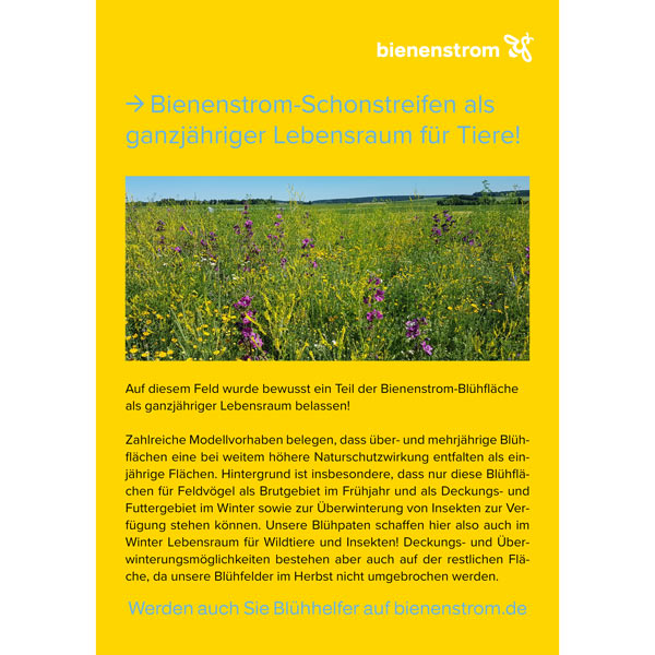 Die Pflanzen, die auf den ersten Blick nicht besonders ansprechend aussehen, leisten einen wichtigen Beitrag für die Artenvielfalt. Zahlreiche Modellvorhaben belegen, dass mehrjährige Blühflächen eine höhere Naturschutzwirkung entfalten als einjährige Flächen. Hintergrund ist insbesondere, dass nur diese Blühflächen für Feldvögel als Brutgebiet im Frühjahr und als Deckungs- und Futtergebiet im Winter sowie zur Überwinterung von Insekten zur Verfügung stehen können. Die Schonstreifen auf einigen Bienenstrom-Feldern unterstützen also auch im Winter die Artenvielfalt. Und was ist mit den restlichen Flächen? Auch auf den gemähten Feldern finden Tiere Deckung und Überwinterungsmöglichkeiten, weil die Blühfelder im Herbst nicht umgebrochen werden und nach der Ernte bis zum Winter auch noch etwas nachwachsen können