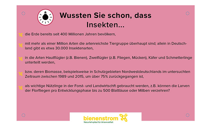 Eine von 20 Infotafeln, die wissenswerte Fakten rund um den Bienenstrom anschaulich darstellt.